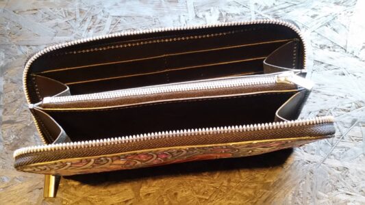 オーダー制作のラウンドファスナー式ロングウォレットですが、図柄は繊細で本格的な和柄で下絵構成して革に落とし込み革細工制作している逸品です。