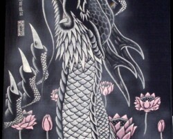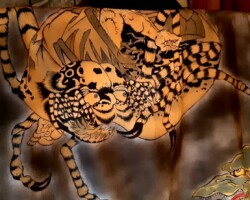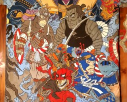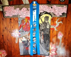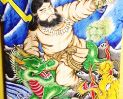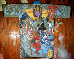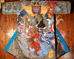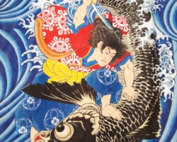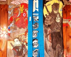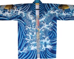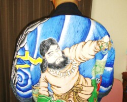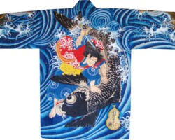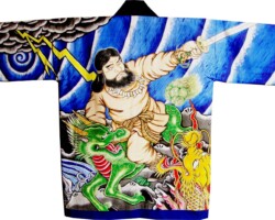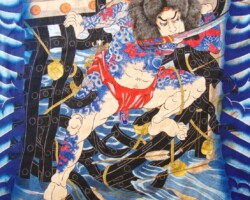 人気の図柄では、浮世絵師の歌川国芳、月岡芳年、葛飾北斎 作品の水滸伝、武者絵等の絵付けを祭り衣料品や法被、半纏等に絵付けします。