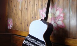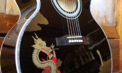 写真のギターペイントでは、ものまねタレント千春・Mさんからのご依頼で松山千春さんご本人が愛用なさっている龍ギターを完全コピーで制作して欲しいとのご依頼で制作したギターです。松山千春さん愛用ギターの資料写真が少なく苦労したのですが格好良い仕上がりになりました。